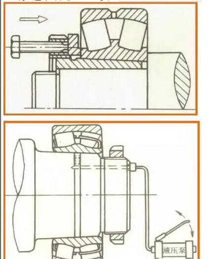 拆卸大型錐孔軸承,往往利用油壓的方法。在錐形軸上的油孔中加壓送油,使內圈膨脹來拆卸錐孔軸承。在實際操作中必須設置某種形式的止動裝置,如螺母或端蓋,以限制軸承的軸向脫出。