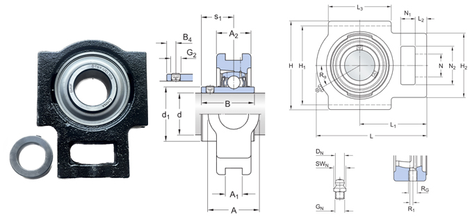 滑塊式球軸承單元包含一個安裝在灰鑄鐵軸承座內(nèi),基于密封深溝球軸承的嵌入式軸承。 它們通常安裝在調(diào)緊框架內(nèi),內(nèi)圈兩側(cè)加長,通過擰緊內(nèi)圈上的(緊定)螺釘鎖定,便于安裝。